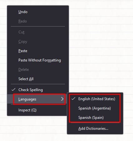 بمجرد أن تضيف جميع المعاجم التي تحتاجها، إليك كيفية التبديل بينها عند تغيير اللغات. انقر بزر الفأرة الأيمن في أي مكان على مفكرة كتابة النص. ضع المؤشر على خيار 'اللغات'. عندما يظهر القائمة الجانبية، ستشاهد اللغات المختلفة. انقر على اللغة التي تريد تحديدها، وهذا كل ما في الأمر.