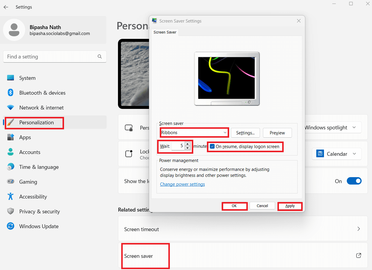 هذه طريقة مفيدة للغاية لأولئك الذين يجدون أنفسهم خارج مكاتبهم لفترة أطول مما هو متوقع. في مثل هذه الحالات، يمكنك التأكد من أن شاشتك تُقفل إذا ظلت غير نشطة لفترة محددة مسبقًا. بالإضافة إلى ذلك، تتضمن الطريقة استخدام الصورة أو النص المفضل لديك كخلفية شاشة التوقف. يمكن لمستخدمي ويندوز 11 متابعة هذه الخطوات وتمكين شاشة التوقف لتظهر على شاشة القفل بعد فترة زمنية محددة مسبقًا.