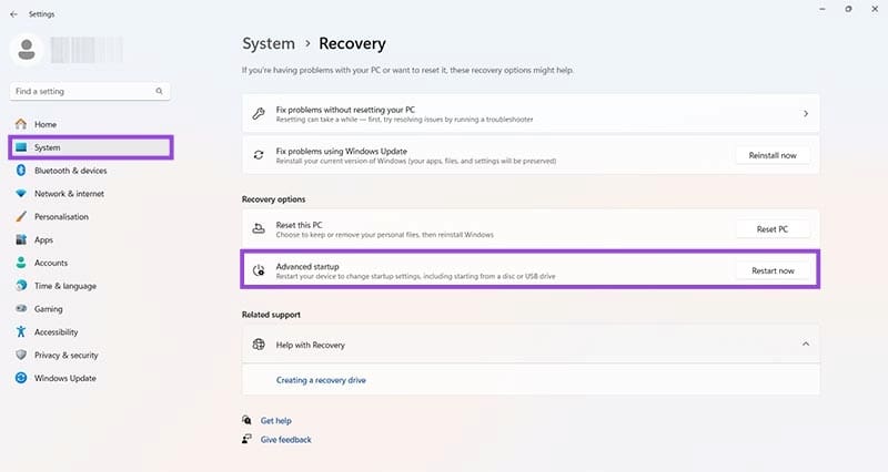 Paso 2: Ir a “Sistema” y luego a “Recuperación”.