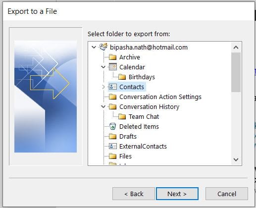 Cochez la case à côté de l'option Exporter « Contacts » du dossier : Contacts.