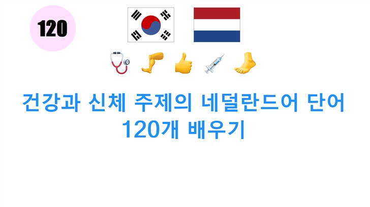이 비디오에서는 건강과 신체 주제에 관련된 120개의 네덜란드어 단어를 배우고 오디오로 듣고 발음 연습을 할 수 있습니다.
