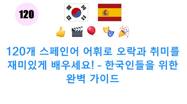 스페인어 어휘를 통해 오락과 취미 주제를 탐구하세요. 이 가이드에서 120개 스페인어 어휘를 오디오로 듣고, 발음과 의미를 쉽게 배웁니다. 한국어 사용자에게 최적화된 학습 방법!